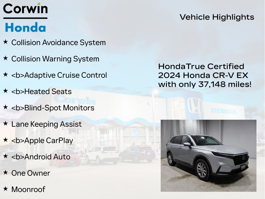 SAVE BIG IN 2026 WITH A GREAT DEAL ON ONE OF OVER 200 PRE-OWNED VEHICLE'S AT CORWIN HONDA. Priced below KBB Fair Purchase Price! 2024 Lunar Silver Metallic Honda CR-V EX AWD Certified. CARFAX One-Owner. Clean CARFAX.