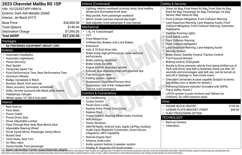 This Chevrolet Malibu is well equipped with these key features and benefits, Lane Keeping Assist, *Apple CarPlay, Android Auto, One Owner, Jet Black w/Premium Cloth Seat Trim, Preferred Equipment Group 1SP, Remote Vehicle Starter System.
