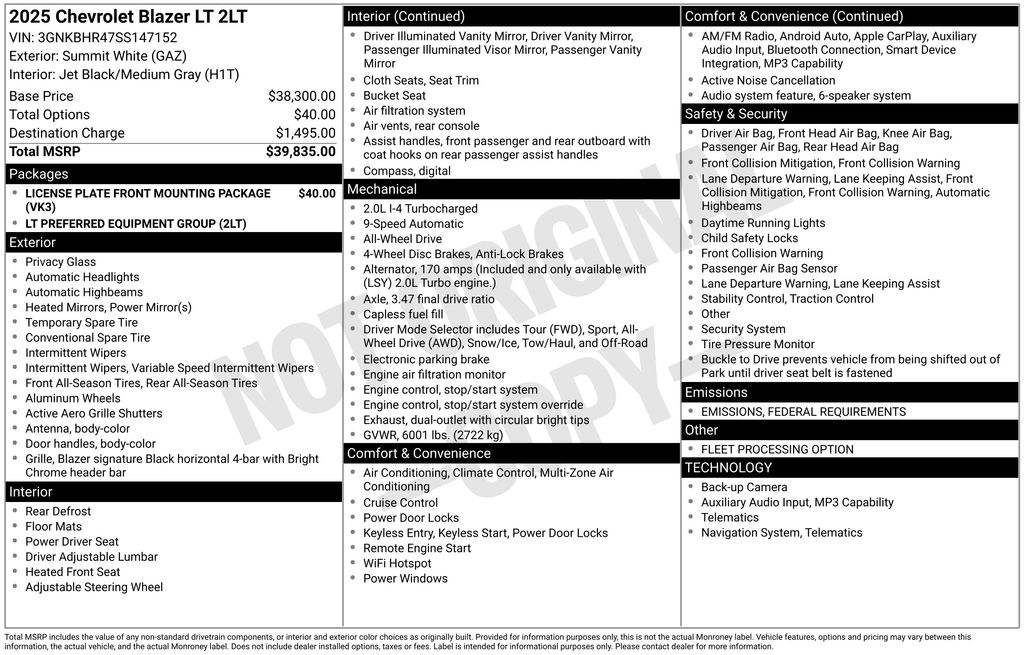 COME ON IN TO CORWIN Honda FOR OUR BLACK FRIDAY PRICING ALL MONTH LONG! TREMENDOUS LINEUP ON OUR OVER 200 PRE-OWNED VEHICLES AT ONE LOCATION!!! Priced below KBB Fair Purchase Price! 2025 Summit White Chevrolet Blazer LT AWD CARFAX One-Owner. Clean CARFAX.