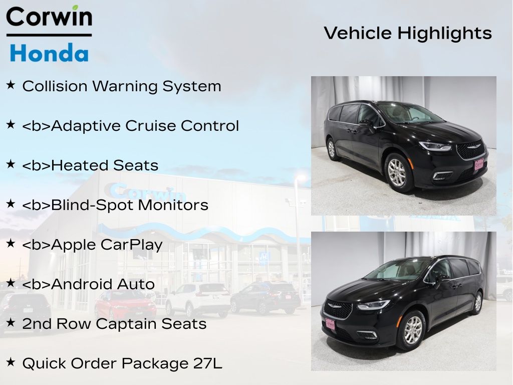 This Chrysler Pacifica is well equipped with these key features and benefits, Collision Warning System, *Adaptive Cruise Control, Heated Seats, Blind-Spot Monitors, Apple CarPlay, Android Auto, 2nd Row Captain Seats, Quick Order Package 27L. Odometer is 592 miles below market average!