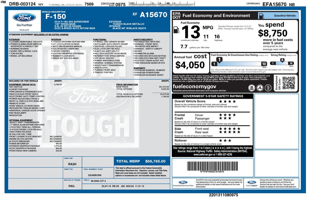 The Equipment Group 801A Luxury package further enhances the Raptor's capabilities with features like voice-activated navigation, a premium Sony audio system, and a suite of advanced driver-assistance technologies. With the SYNC with MyFord Touch system, you'll enjoy seamless connectivity and intuitive voice controls, keeping you informed and entertained on every journey.