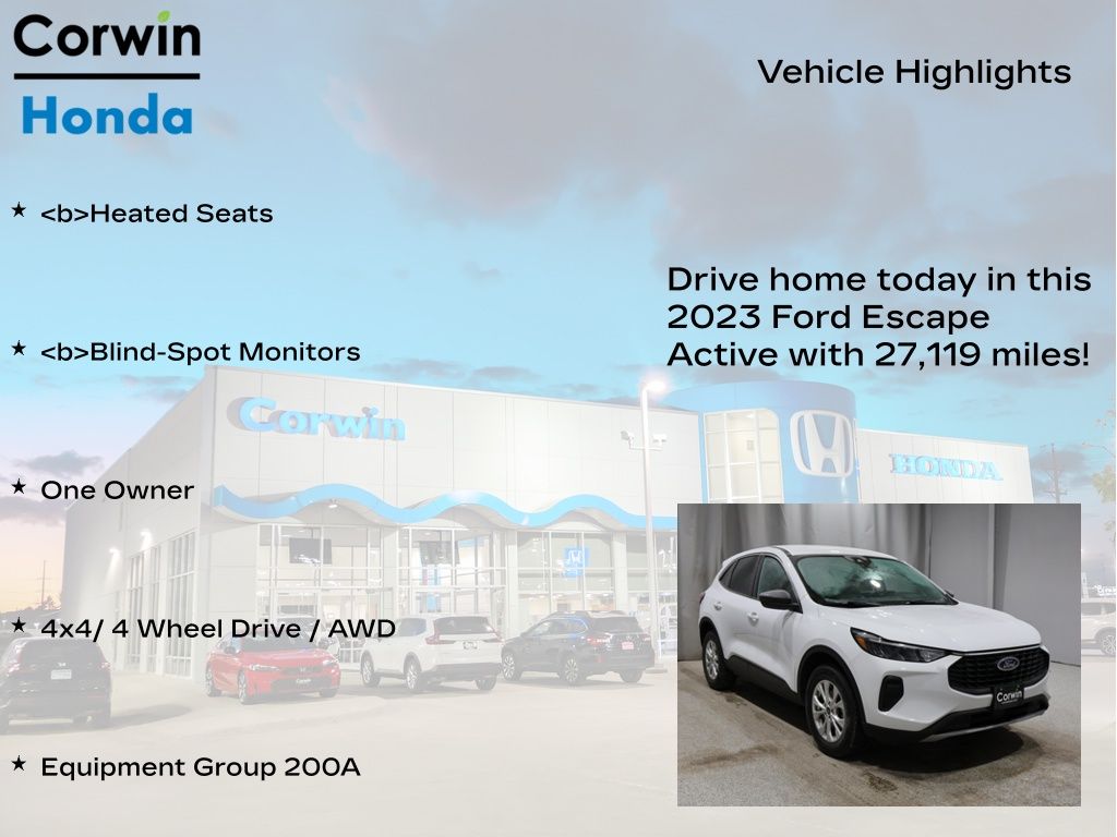 COME ON IN TO CORWIN Honda FOR OUR BLACK FRIDAY PRICING ALL MONTH LONG! TREMENDOUS LINEUP ON OUR OVER 200 PRE-OWNED VEHICLES AT ONE LOCATION!!! Recent Arrival! Priced below KBB Fair Purchase Price! 2023 Oxford White Ford Escape Active AWD CARFAX One-Owner. Clean CARFAX.