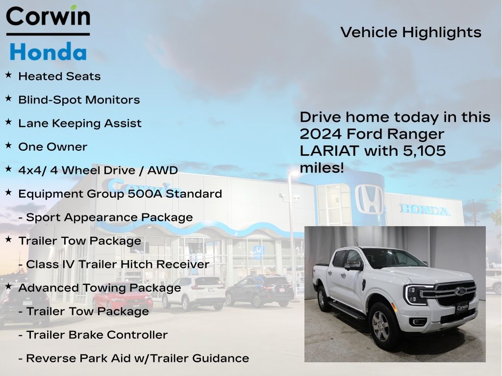 Discover the perfect blend of capability, comfort, and style in this 2024 Ford Ranger Lariat. This exceptional mid-size truck is ready to take on any adventure, whether you're hauling heavy loads or exploring the great outdoors.