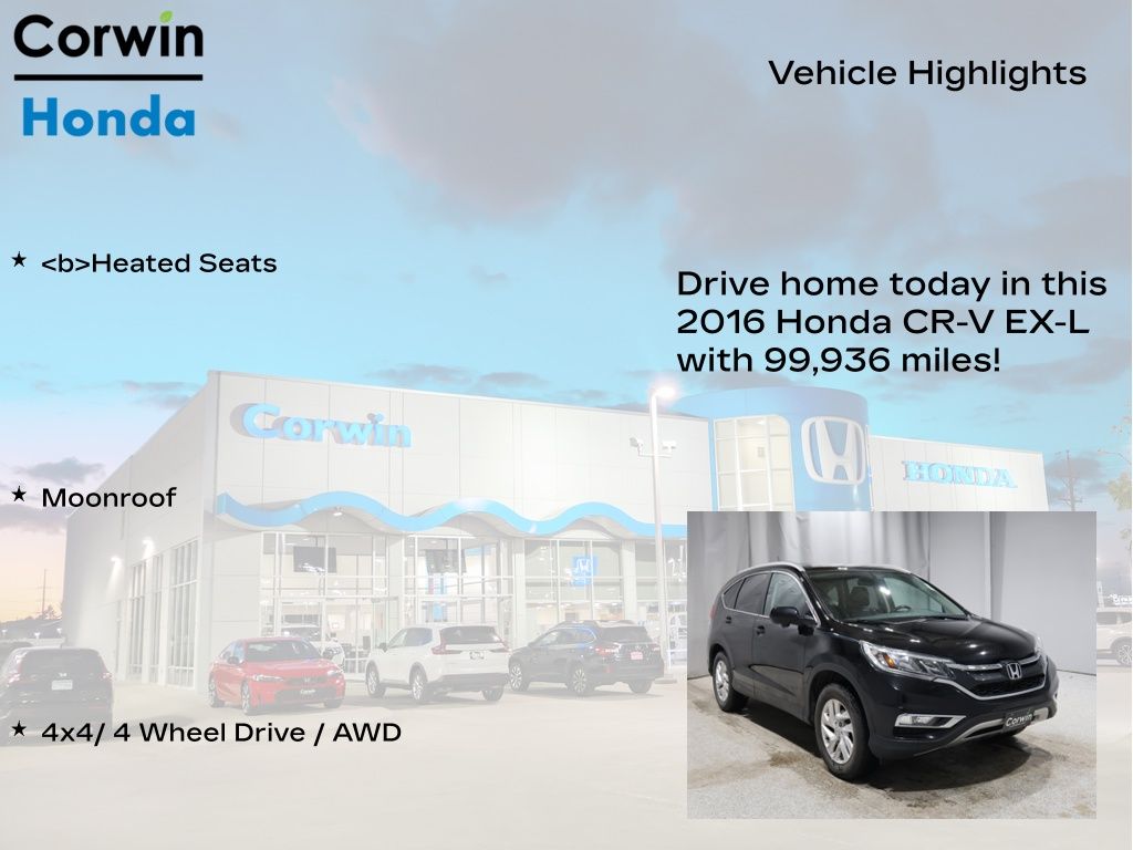 COME ON IN TO CORWIN Honda FOR YEAR END PRICING ON OVER 200 PRE-OWNED VEHICLES!! Recent Arrival! 2016 Crystal Black Pearl Honda CR-V EX-L AWD Clean CARFAX.