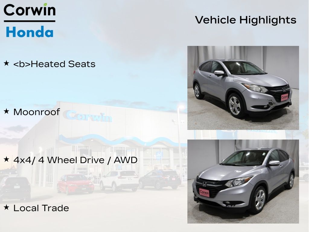 This Honda HR-V is well equipped with these key features and benefits, *Heated Seats, Moonroof, 4x4/ 4 Wheel Drive / AWD, Local Trade.
