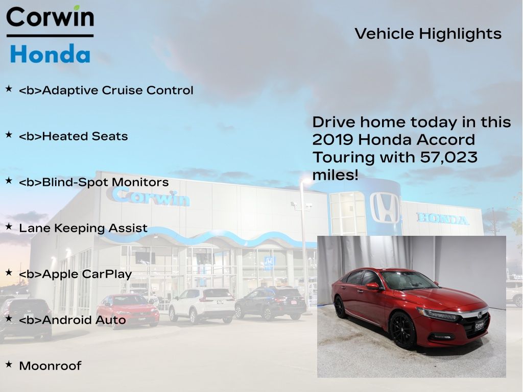 COME ON IN TO CORWIN Honda FOR OUR BLACK FRIDAY PRICING ALL MONTH LONG! TREMENDOUS LINEUP ON OUR OVER 200 PRE-OWNED VEHICLES AT ONE LOCATION!!! Recent Arrival! 2019 Radiant Red Metallic Honda Accord Touring 2.0T FWD Clean CARFAX.