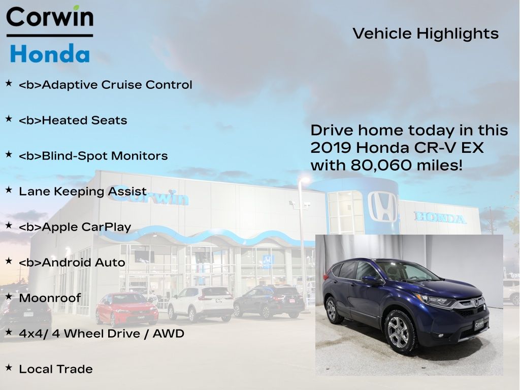COME ON IN TO CORWIN Honda FOR OUR BLACK FRIDAY PRICING ALL MONTH LONG! TREMENDOUS LINEUP ON OUR OVER 200 PRE-OWNED VEHICLES AT ONE LOCATION!!! Recent Arrival! 2019 Obsidian Blue Pearl Honda CR-V EX AWD