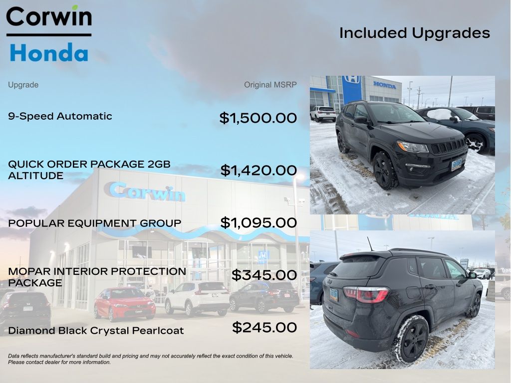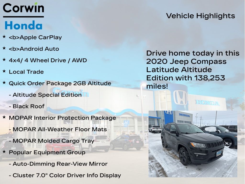COME ON IN TO CORWIN Honda FOR YEAR END PRICING ON OVER 200 PRE-OWNED VEHICLES!! Recent Arrival! 2020 Diamond Black Crystal Pearlcoat Jeep Compass Altitude 4WD