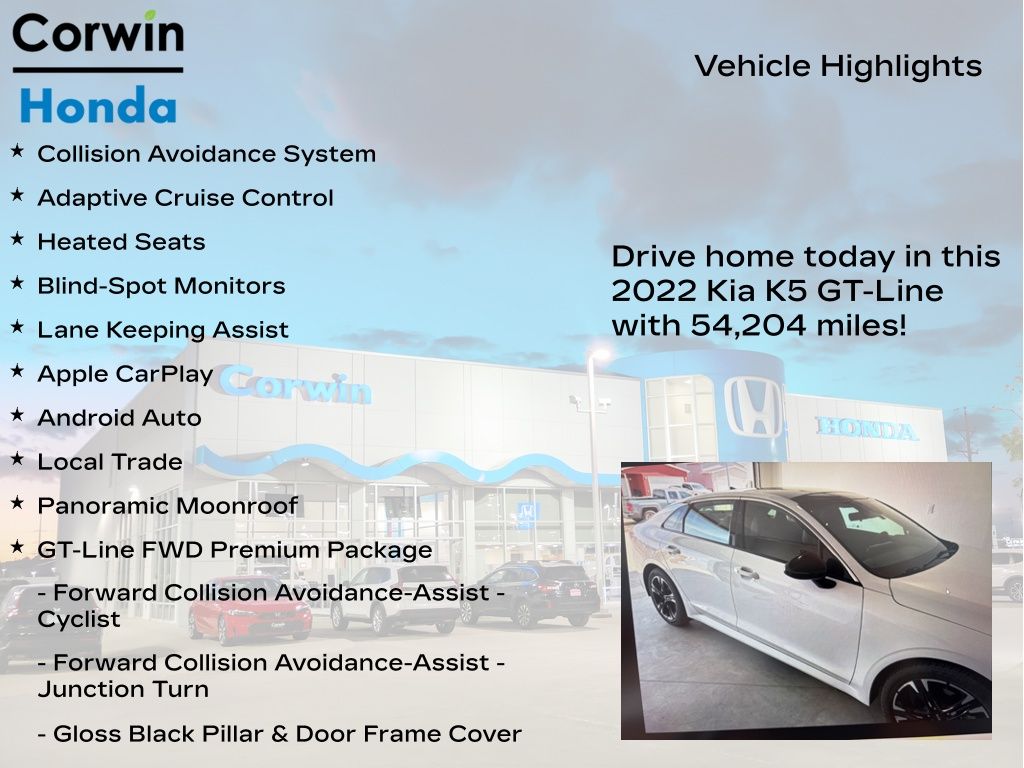 Discover the perfect balance of style, performance, and innovation with this stunning 2022 Kia K5 GT-Line. This exceptional sedan is a true testament to Kia's commitment to delivering exceptional value and an unparalleled driving experience.