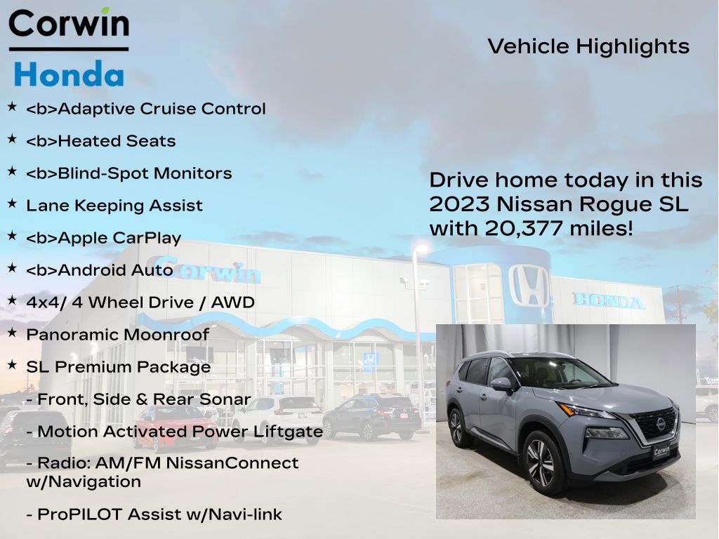 This Nissan Rogue is well equipped with these key features and benefits, *Adaptive Cruise Control, Heated Seats, Blind-Spot Monitors, Lane Keeping Assist, Apple CarPlay, Android Auto, 4x4/ 4 Wheel Drive / AWD, Panoramic Moonroof, AWD, Front, Side & Rear Sonar, Motion Activated Power Liftgate, ProPILOT Assist w/Navi-link, Radio: AM/FM NissanConnect w/Navigation, Rear Door Sunshades, SL Premium Package, Traffic Sign Recognition, Tri-Zone HVAC. Odometer is 16839 miles below market average!