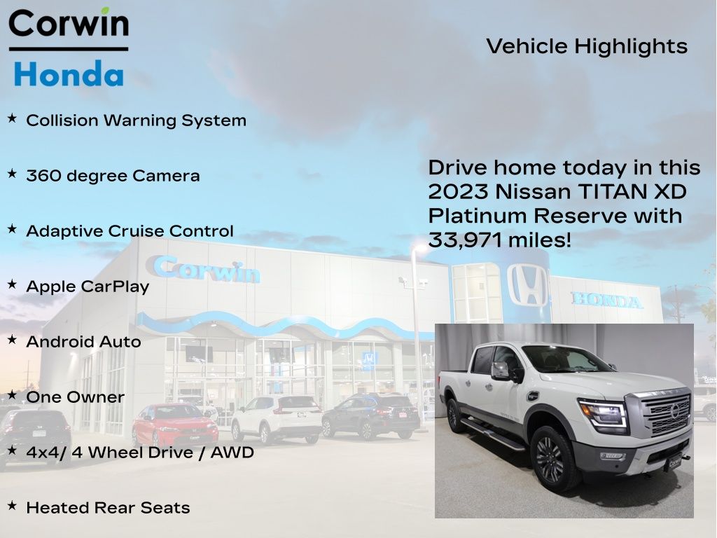 Discover the ultimate in power, capability, and comfort with the 2023 Nissan Titan XD Platinum Reserve. This exceptional full-size pickup is poised to elevate your driving experience, offering a perfect blend of rugged performance and refined luxury.