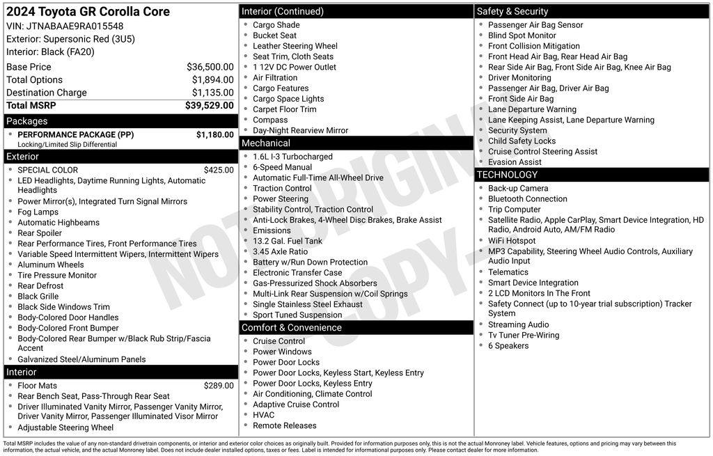 Equipped with a potent 1.6L I3 PDI Turbocharged DOHC 12V engine, the GR Corolla Core delivers an impressive 300 horsepower, channeled through a thrilling 6-speed manual transmission and Toyota's renowned All-Wheel Drive system. This combination of power and precision ensures an exhilarating driving experience, whether you're navigating winding roads or tackling challenging terrain.