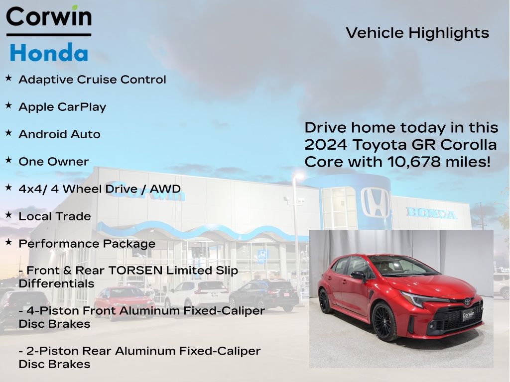 This exceptional 2024 Toyota GR Corolla Core, with just 10,662 miles, is a rare find that offers an unparalleled blend of performance, style, and technology. Experience the thrill of driving like never before and schedule a test drive today. We're confident this GR Corolla Core will exceed your expectations and leave a lasting impression.